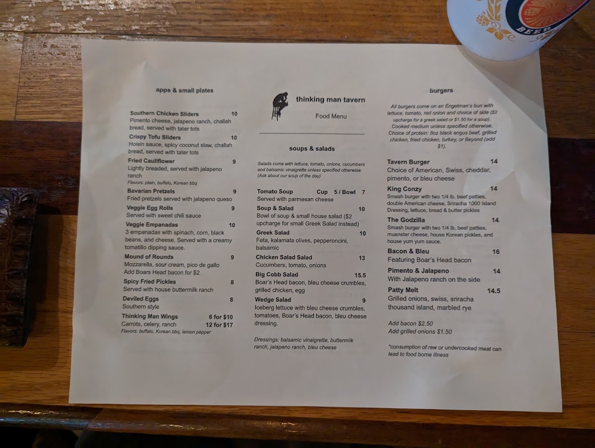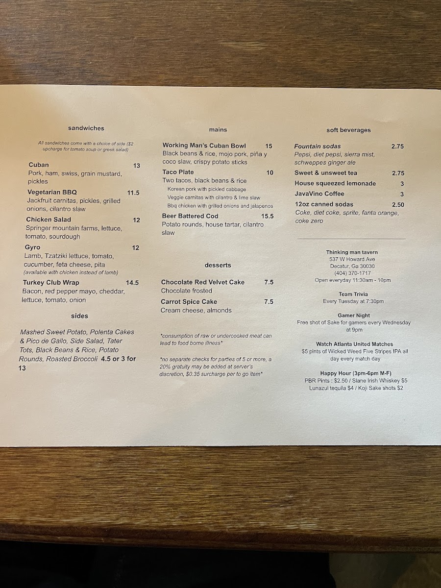 Introducing the menu at Thinking Man Tavern, located in Decatur, GA, is a delightful experience that combines a vibrant atmosphere with an impressive selection of delicious dishes. The menu features a variety of sandwiches, with highlights like the tender Lamb Gyro and the flavorful Cuban Pork that will have your taste buds dancing. For those leaning vegetarian, the BBQ Jackfruit Carnitas offers a unique twist that’s rich in flavor for just $11.50.
